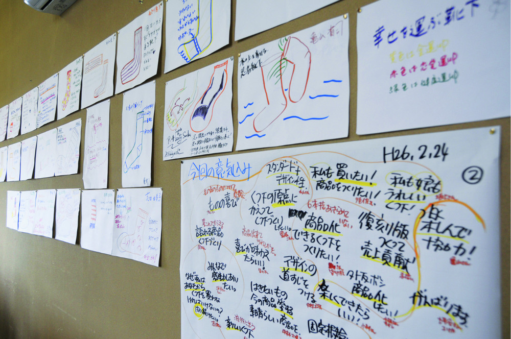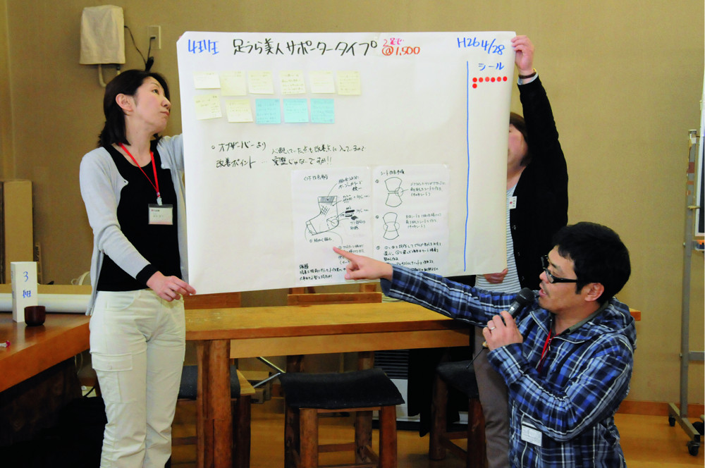 中林社長は、「靴下を通じて健康を売る」という大義のもとに、地域に根ざして、世界から多くの人々が訪れる魅力あふれる企業のあり方を追求し、世界とお客様とダイレクトにつながる、そんな世界一の靴下工場を目指しておられます。この「商品開発プログラム研修」は、靴下の製造部門である靴下工場の全スタッフが中心となって、自ら欲しくて欲しくてしかたがない商品を開発する研修です。この研修にはワークショップ手法を取り入れて、中林社長をはじめベテラン社員や、普段開発に関わっているスタッフも一体となってのモノ作りを行います。この研修からモノづくりに対する全員の想いが一つとなり、見事ヒット商品が誕生。毎年、継続して実施されています。